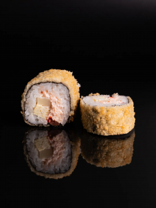 креветка темпура, лист салата, сыр сливочный, пикантный соус, снежный краб, омлет, ягодный соус, кунжут