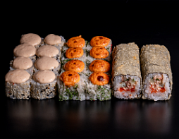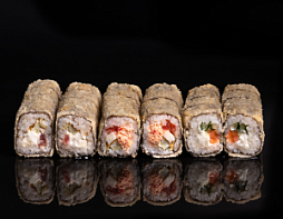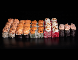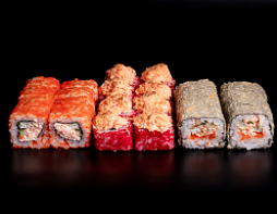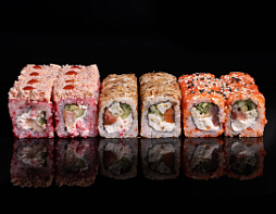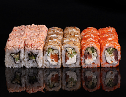 Филадельфия, Калифорния тобико,  Бонито с тунцом, Хосомаки с огурцом, Хосомаки с лососем, Хрустящая креветка, Сливочный лосось темпура, Лосось гриль