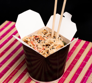 Фирменная коробочка Курица Кунг-Пао: На рисе выложена курица, тушеная в остром соусе с добавлением водорослей чука