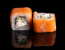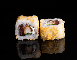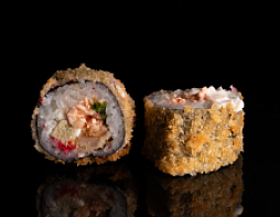 сыр творожный, жареный лосось, огурцы, помидор, моцарелла, красная масаго, стружка тунца, кляр, сухари