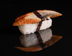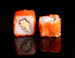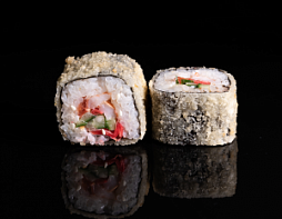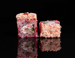 Рис, масаго красная, сыр творожный, креветка темпура, огурцы, краб