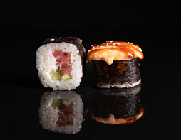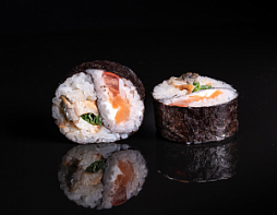 лосось, угорь, сыр творожный, помидоры, лук зелёный, спайси соус